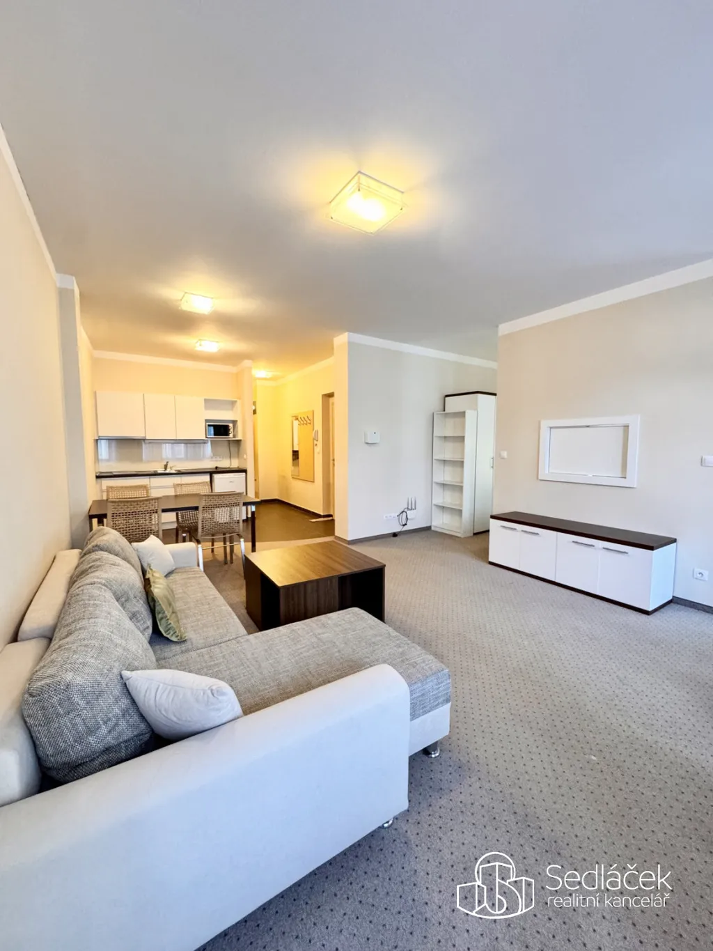 Byt je dispozičně velmi dobře řešen. Kuchyňská linka je vybavena varnou deskou, lednicí a mikrovlnnou troubou. Obývací část je prakticky rozdělena příčkou, za kterou se nachází dvoulůžková postel, což zajišťuje příjemné oddělení denní a klidové zóny.