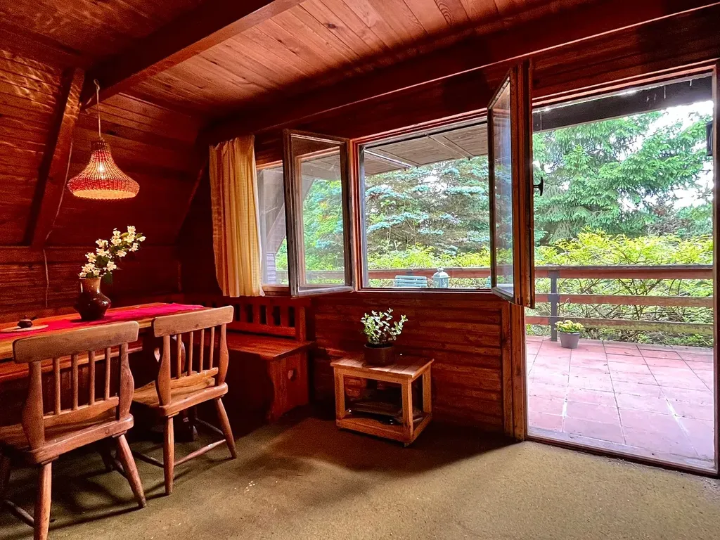 Dispozičně se jedná o 3+kk hl. obytná místnost se vstupem na terasu (přístupná i ze zahrady), kuchyňským koutem s el. sporákem, krbem, vstupní předsíní a koupelnou se sprchovým koutem a WC. Podkroví s okny nabízí prostor na spaní. Dílna s oknem se nachází pod terasou, kde je dále ještě venkovní úložný prostor na dřevo atd. Tento typ chaty ze 70.let nabízí veškerý komfort včetně přípojky vody na obecní vodovod a přípojky elektřiny.