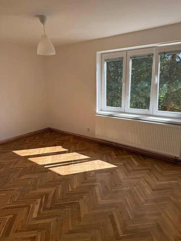 Ložnice: S renovovanými parketami a velkým oknem, které zajišťuje dostatek denního světla.