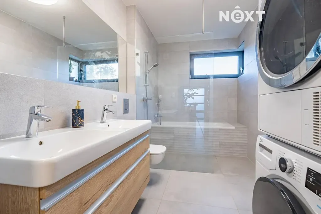 Velkým benefitem je také moderní a úsporný způsob vytápění i ohřevu vody pomocí tepelného čerpadla, které zajišťuje nízké provozní náklady a energeticky efektivní provoz domu.