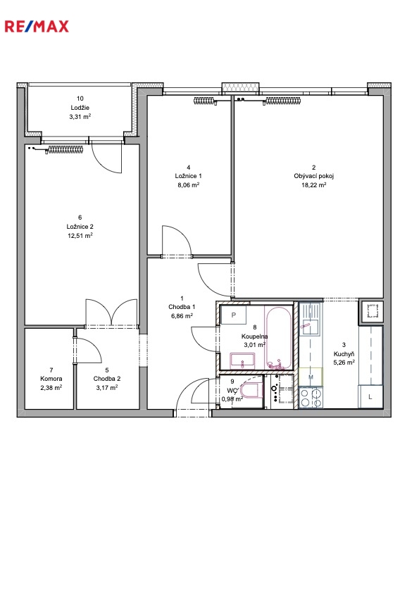 Dispozice bytu je praktická a dobře využitelná. Byt nabízí obývací pokoj s odděleným kuchyňským koutem, dva samostatné pokoje, koupelnu s vanou, samostatné WC a předsíň. U ložnice s lodžií se nachází menší komora, která poskytuje další úložný prostor.