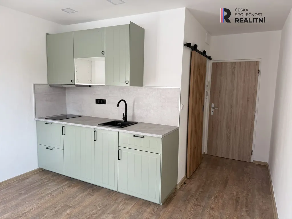 Dominantou bytu je moderní kuchyňská linka v jemném zeleném odstínu, vybavená indukční varnou deskou, dřezem s černou baterií a dostatkem úložného prostoru. Kuchyň je elegantně propojena s obytnou částí, která nabízí dostatek místa pro obývací i spací zónu.