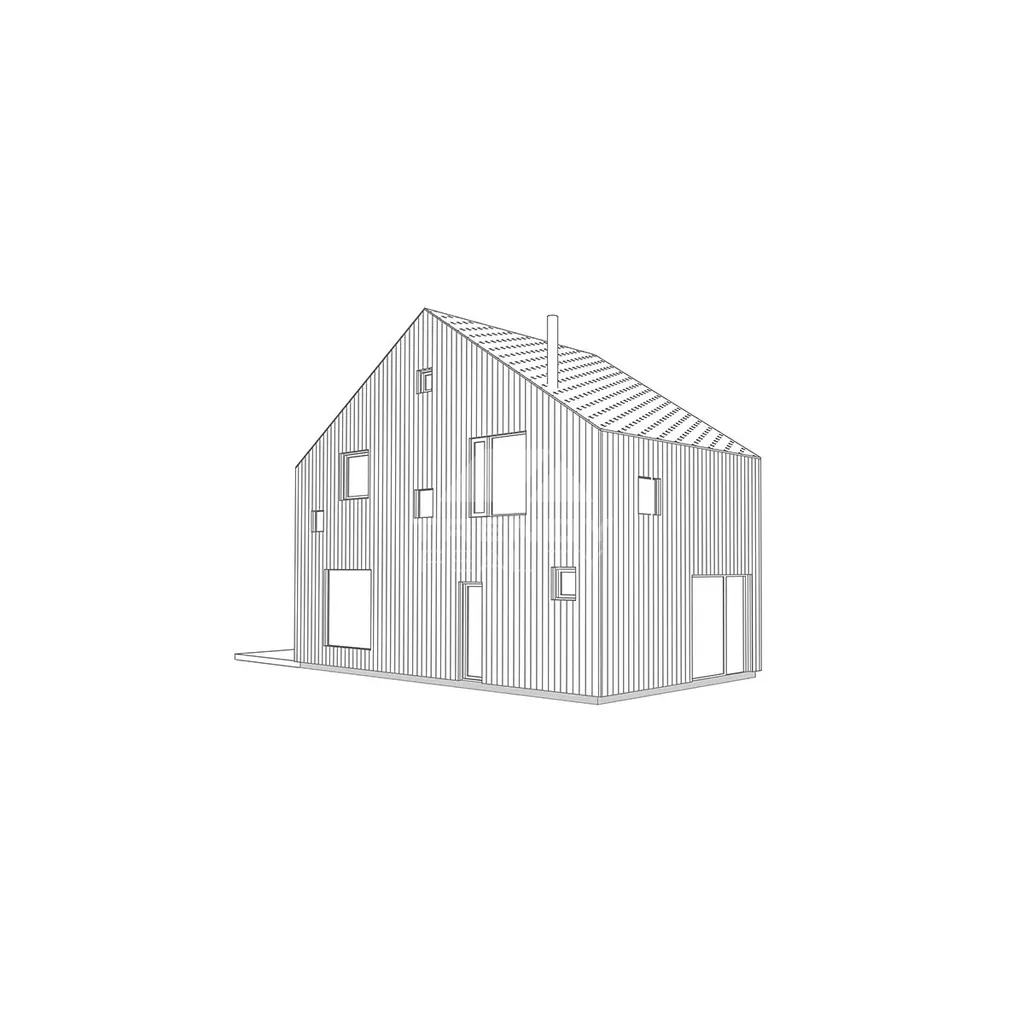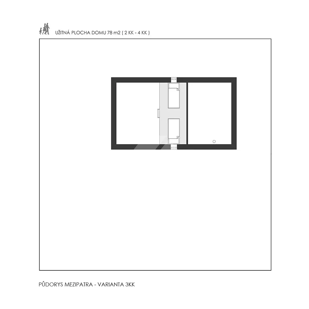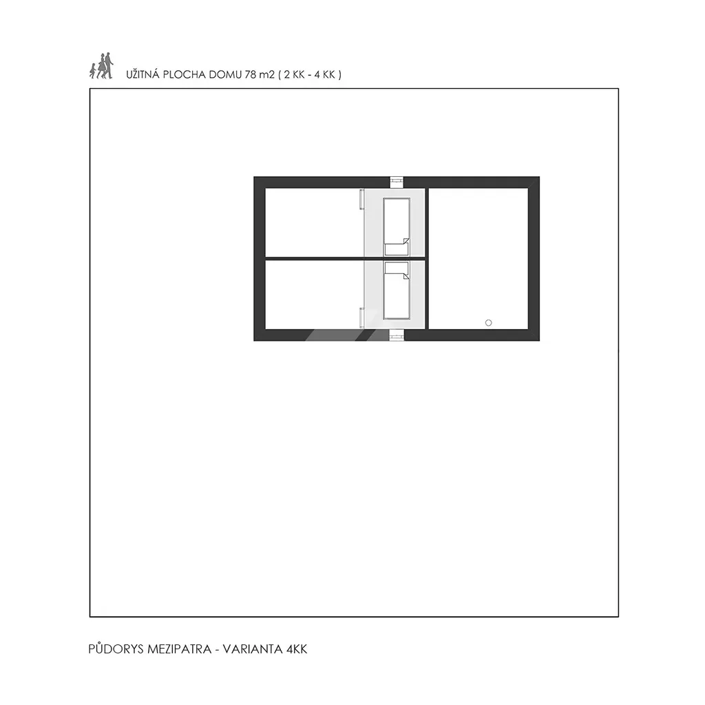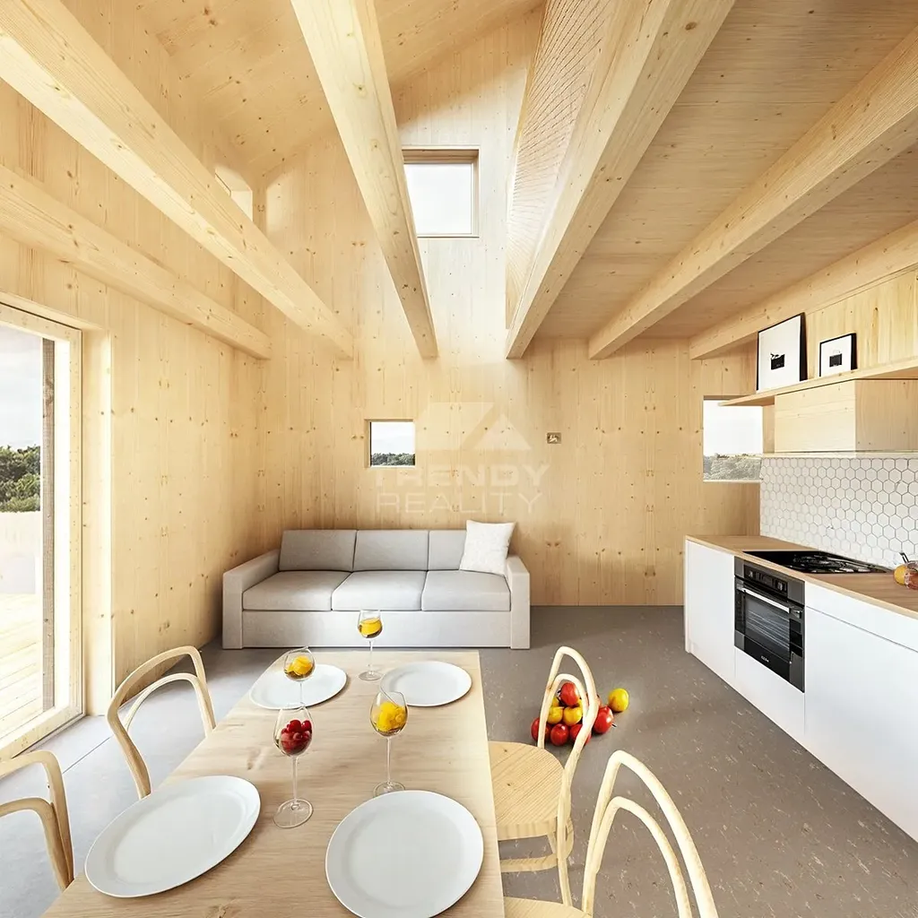 Kompaktní dům pro celý život: přízemí s obytným prostorem a kuchyní (36 m²). Patro s mezipatrem umožňuje variabilitu – začíná jako 2+KK pro mladý pár, lze upravit na 3+KK pro rodinu s dětmi nebo 4+KK s dvěma ložnicemi po 11 m². Po odchodu dětí se vrací k původní otevřené dispozici. Moderní dřevěný design s krytou terasou. Nízkoenergetická konstrukce domu s podlahovým topením zajišťuje nízké provozní náklady na vytápění a maximální komfort.