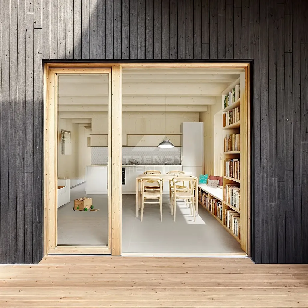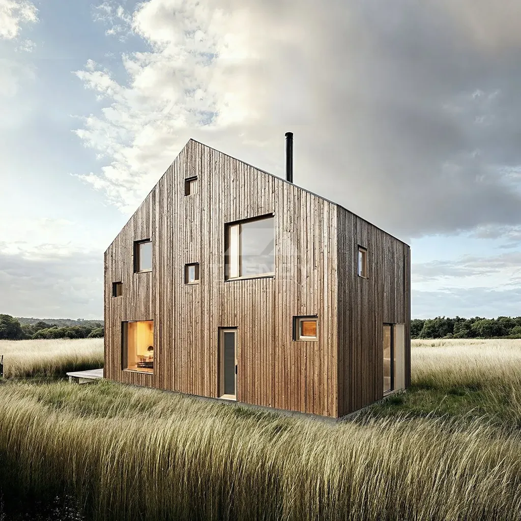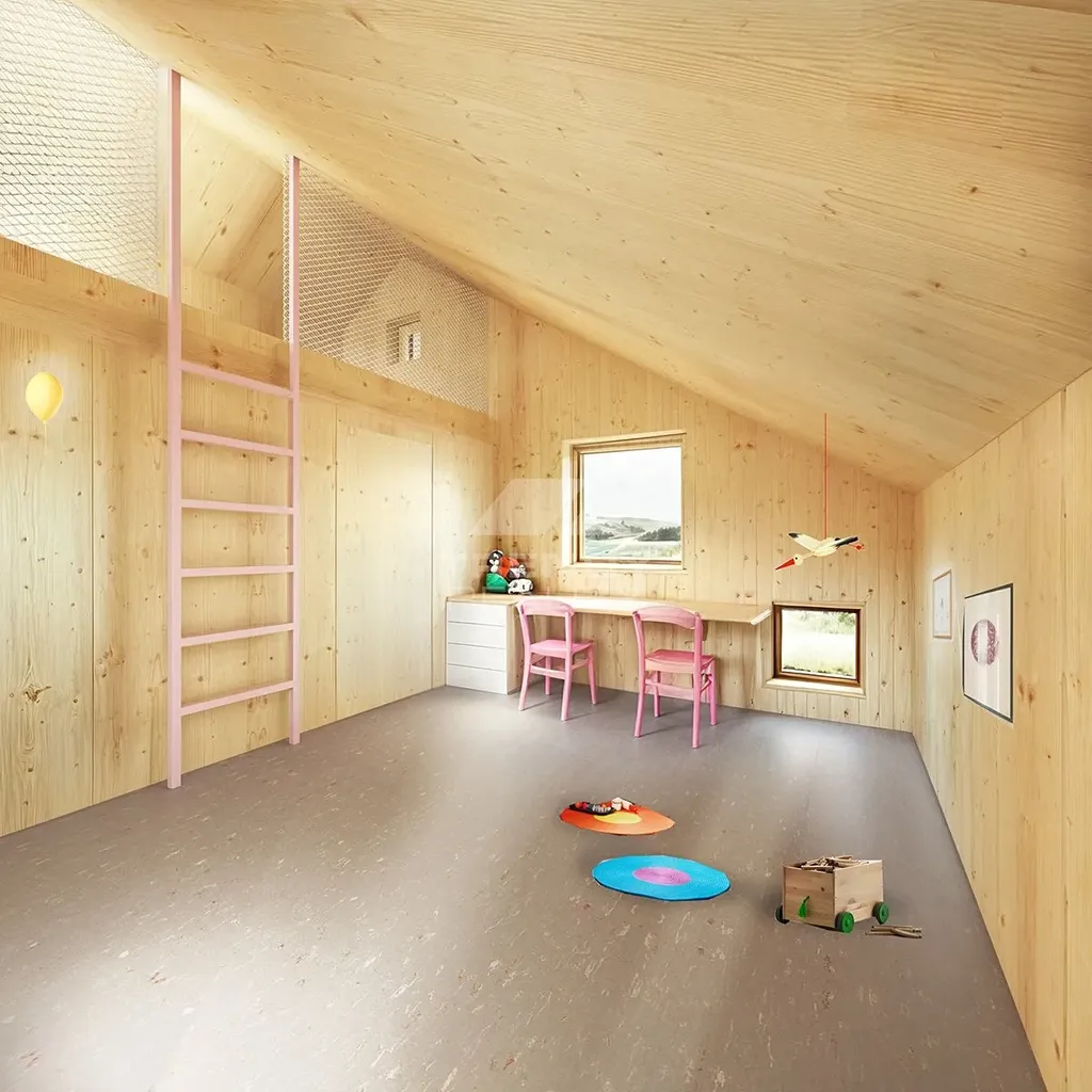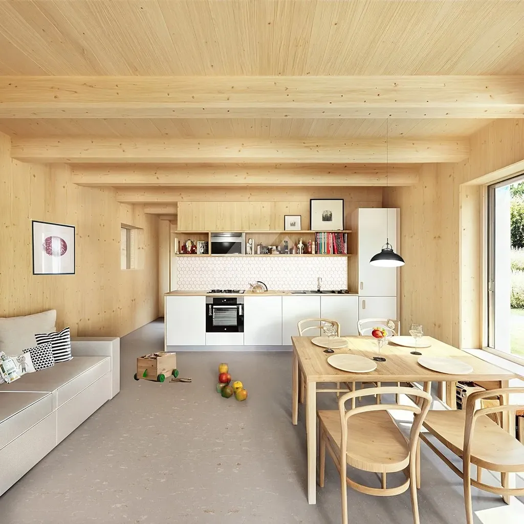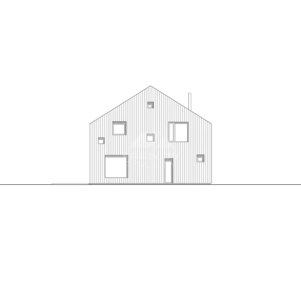 Kompaktní dům pro celý život: přízemí s obytným prostorem a kuchyní (36 m²). Patro s mezipatrem umožňuje variabilitu – začíná jako 2+KK pro mladý pár, lze upravit na 3+KK pro rodinu s dětmi nebo 4+KK s dvěma ložnicemi po 11 m². Po odchodu dětí se vrací k původní otevřené dispozici. Moderní dřevěný design s krytou terasou. Nízkoenergetická konstrukce domu s podlahovým topením zajišťuje nízké provozní náklady na vytápění a maximální komfort.