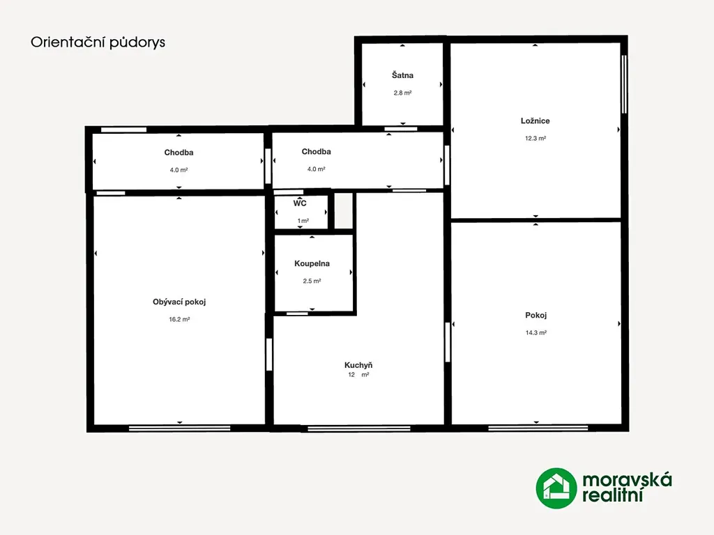 - tři obytné místnosti 16,2m2, 14,3m2 a 12,3m2