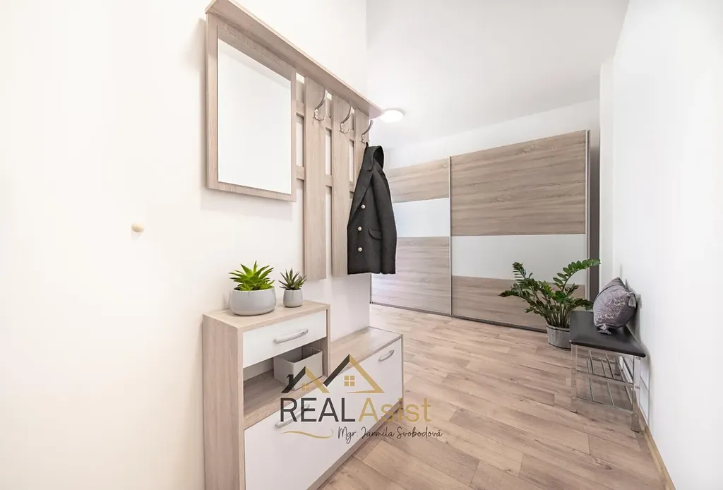 Při vstupu do bytu vejdeme do předsíně s prostornou šatní skříní, kterou využijete nejenom na uložení šatních věcí. Z předsíně vedou dveře do koupelny, samostatné WC a obývacího pokoje s kuchyní.