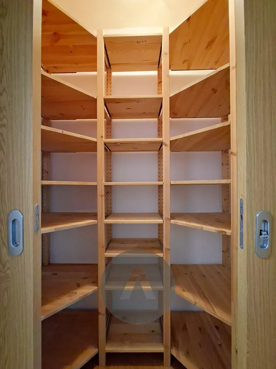 Druhá technická místnost je osazena dřevěným regálem a je vhodná k uložení úklidových prostředků či dalších věcí.
