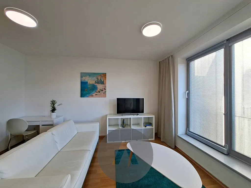 Slunný a prostorný obývací pokoj je vybaven sedací soupravou, konferenčním stolkem, TV stolkem s televizí, psacím stolem se židlí a jídelním stolem se třemi židlemi. Moderní kuchyně disponuje kuchyňskou linkou s indukční varnou deskou, horkovzdušnou troubou, digestoří, granitovým dřezem a lednicí s mrazicím boxem.