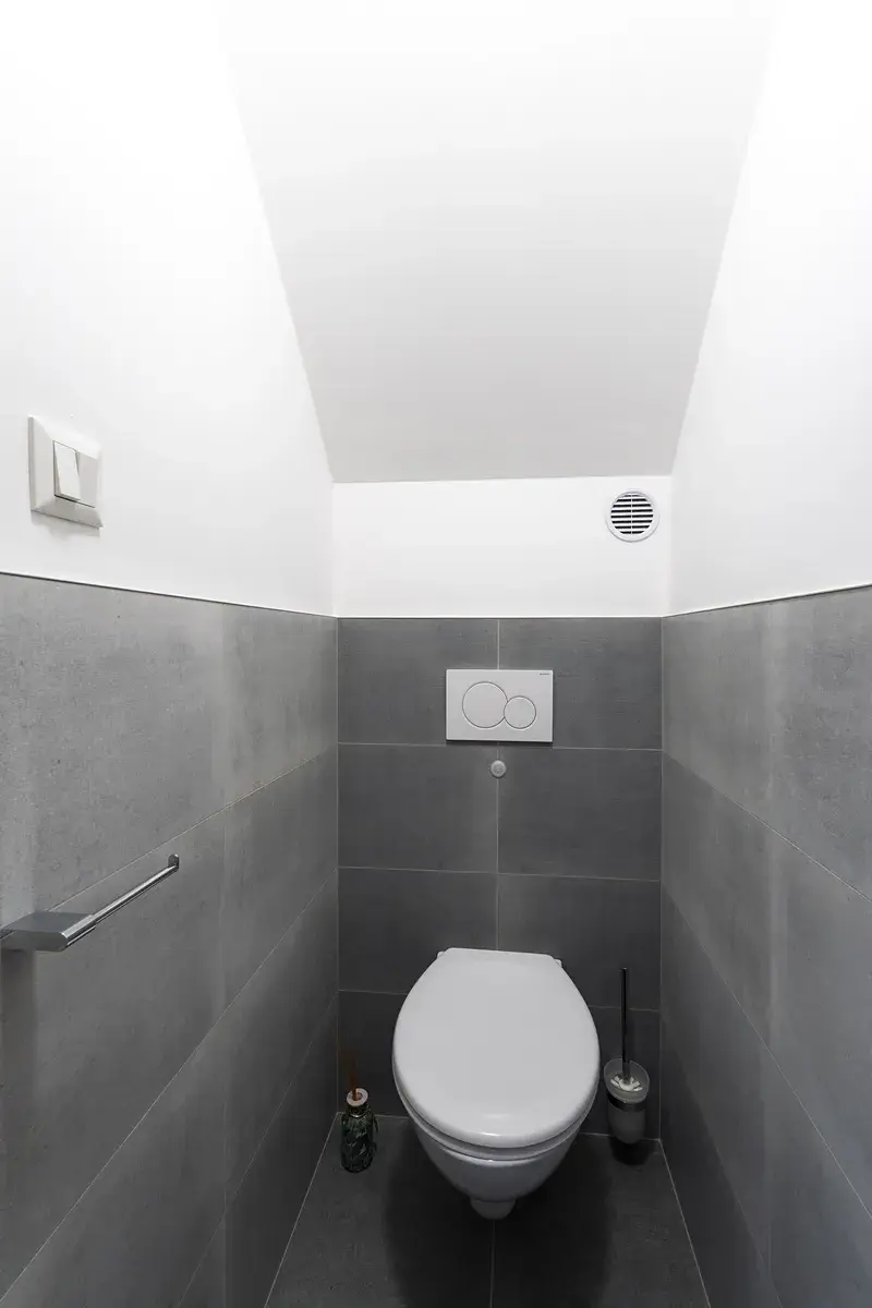 Horní část bytu nabízí dva pokoje, které poskytují dostatek soukromí. Z jednoho z těchto pokojů je přístup na zasklenou lodžii, která je skvělým místem pro relaxaci a užívání si výhledu do okolí. Koupelna je vybavena moderním sprchovým koutem, umyvadlem a je zde také umístěna toaleta.