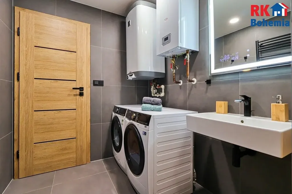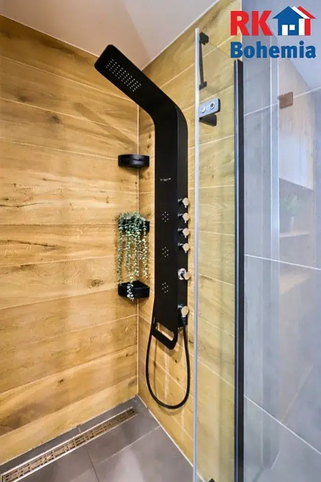 V koupelně se nachází sprchový kout s hydromasážním sprchovým panelem, umyvadlo, topný žebřík, vestavěná koupelnová skříň a příprava na pračku a sušičku.