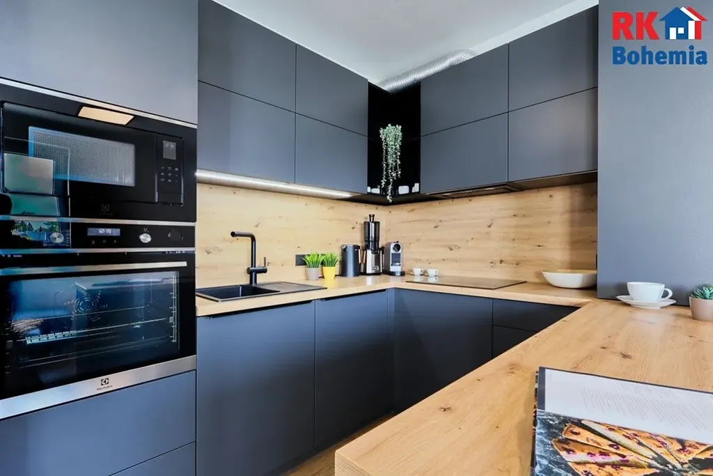Součástí kuchyňské linky jsou vestavěné spotřebiče zn. Electrolux (elektrická trouba, indukční varná deska, mikrovlnná trouba, myčka), digestoř a dřez.