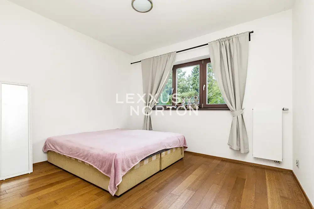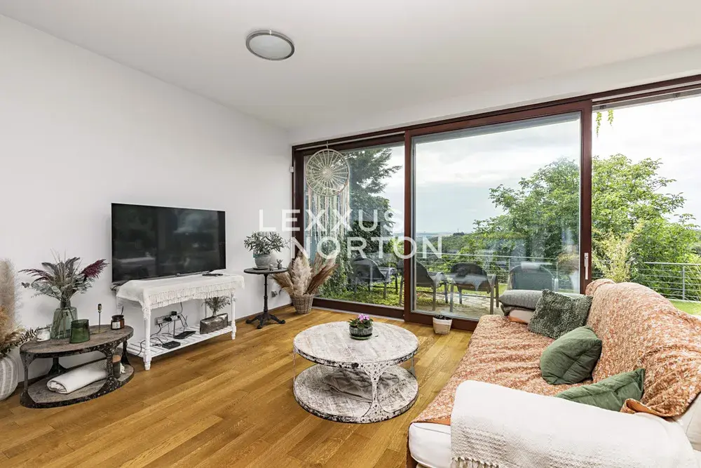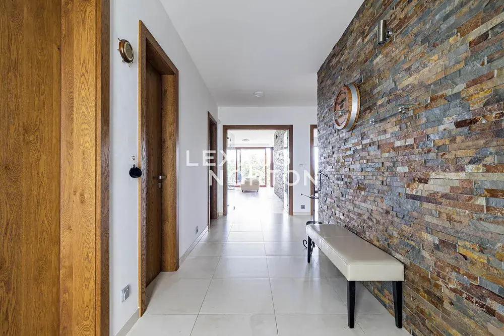 Obytná plocha 190 m2 poskytuje pohodlné bydlení. Interiér se skládá z prostorné vstupní haly, obývacího pokoje s velkými okny, barovým posezením a navazujícím kuchyňským a jídelním koutem. Z obývacího pokoje je vstup na terasu a zahradu. Dále jsou zde dvě ložnice, z nichž jedna má přímý vstup na terasu, dvě koupelny a komoru.