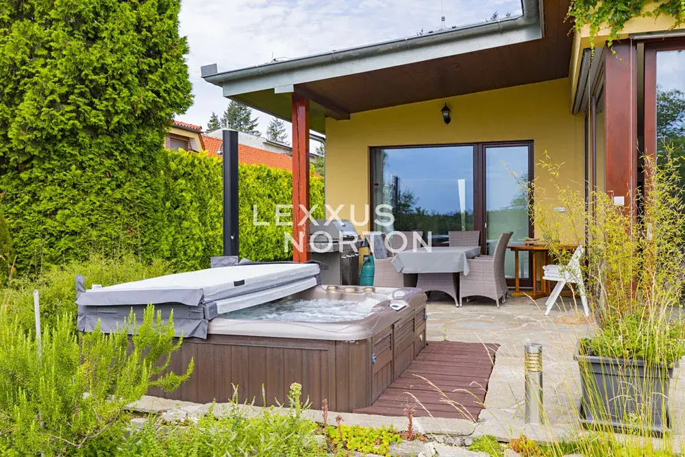 Součástí domu je plně vybavený kuchyňský kout se sporákem, troubou, lednicí, mrazákem, myčkou nádobí a mikrovlnnou troubou. K dispozici jsou dvě koupelny - jedna s vanou a toaletou a druhá se saunou a sprchovým koutem. Vybavení dále zahrnuje vestavěné skříně a pračku. K domu náleží garáž, parkovací stání na pozemku, zahrada s krásným výhledem do údolí a terasa s venkovním posezením, vířivkou a venkovní sprchou.