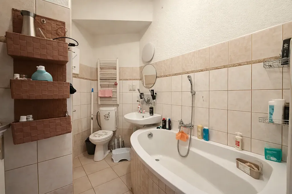 Bytová jednotka je částečně vybavena - plynovou varnou deskou, elektrickou troubou, myčkou sporákem, koupelna je vybavena toaletou a vanou.