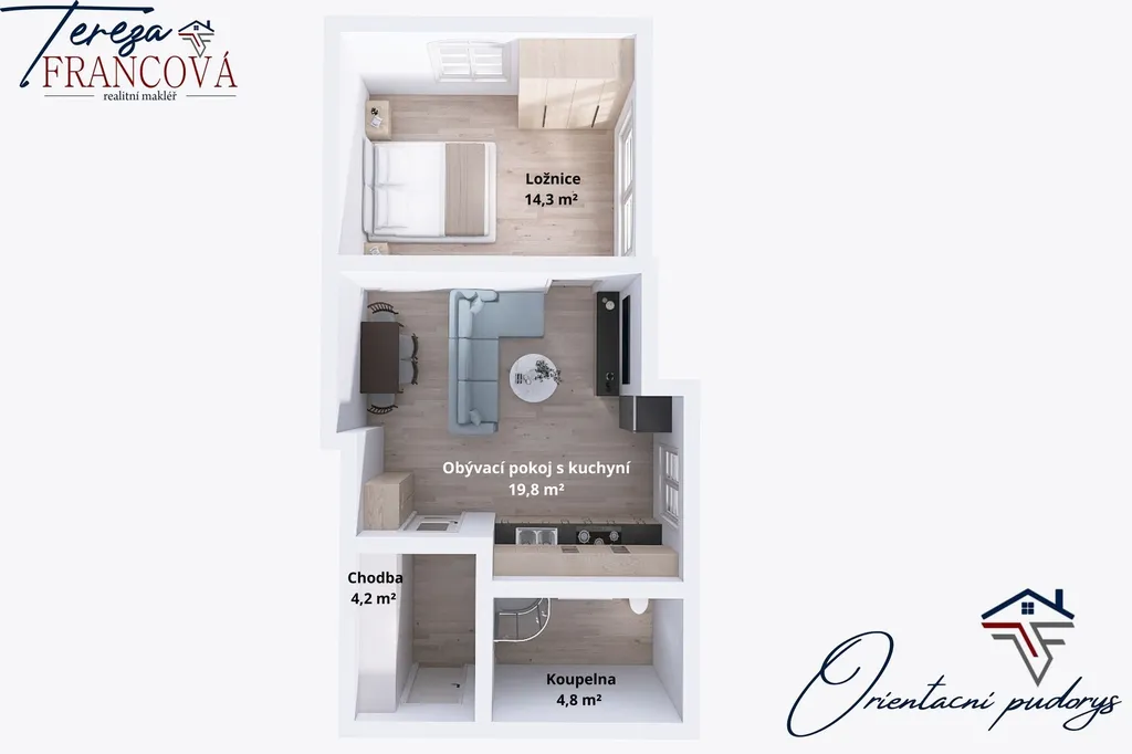 Součástí pronájmu není pohovka, jídelní stůl se židlemi, lednice ani postel, tento nábytek bude z bytu odvezen.