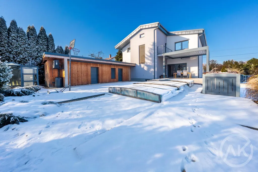Až vás to uvnitř omrzí, vyběhnete přes HS portál na terasu a skočíte si do bazénu. Ten je krytý a vyhřívaný, takže sezona klidně od března do listopadu. Pergola je hliníková, bioklimatická, s výhřevem i zabudovaným osvětlením.