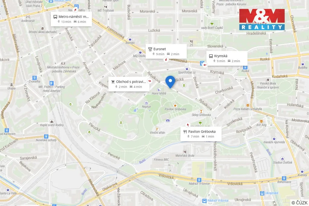 Nabídka pronájmu bytu 2+1 o užitné ploše 60 m² v lukrativní lokalitě na rozhraní Vinohrad a Vršovic, hned u parku Grébovka. Byt se nachází ve 3. patře cihlového domu. Dispozice bytu zahrnuje dva samostatné pokoje, koupelnu se sprchou i vanou a kuchyňský kout v předsíni, samotné wc a komoru. Balkon je dostupný na mezipatře domu. Lokalita nabízí klidné bydlení s výhledem na Prahu a zároveň výbornou dostupnost do centra města. V pěší vzdálenosti 4-10 minut se nachází metro, tramvaj i vlak. Okolí je bohaté na služby a společenské akce v Havlíčkových sadech. Nájem činí 19,5 tis. Kč + 4 tis. Kč poplatky pro 2 osoby. Elektřina se přepisuje na nájemníka. Neváhejte a bydlete v srdci Prahy! Datum možného stěhování od 10.2.