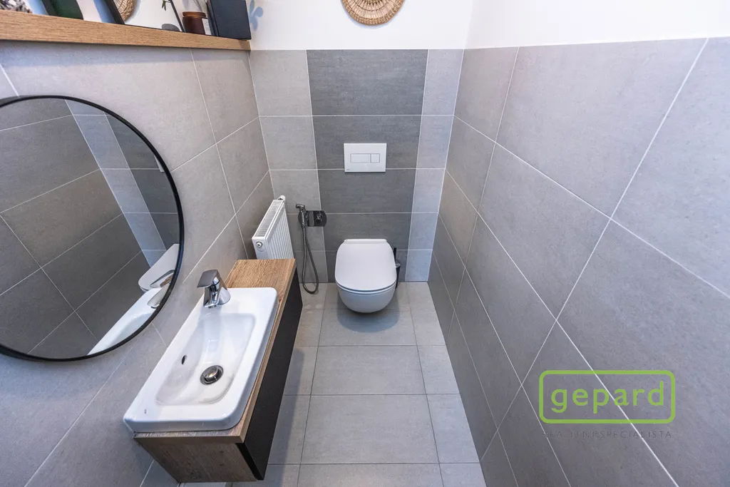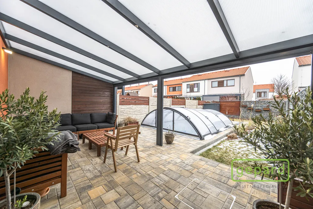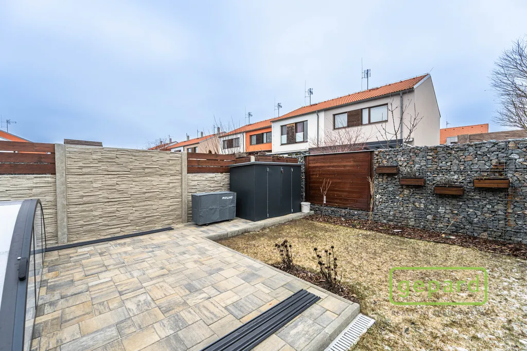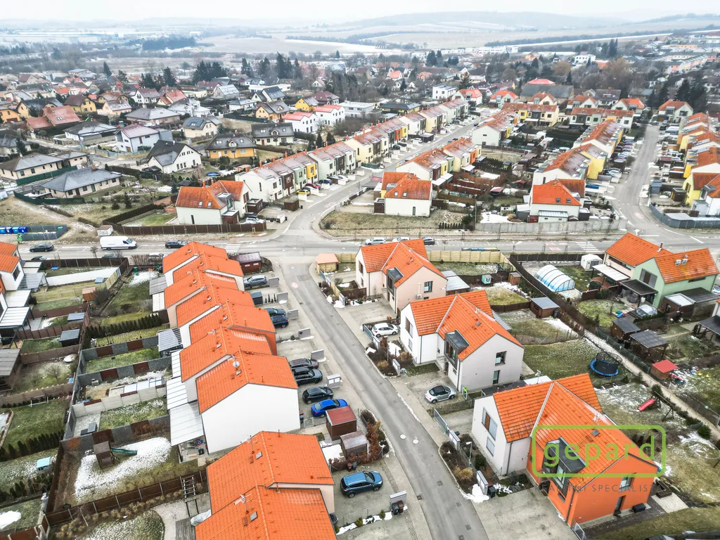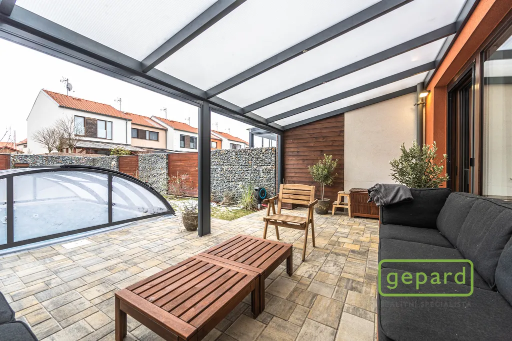 Realitní společnost Gepard nabízí prodej řadového, nadstandardně vybaveného rodinného domu s bazénem. Dvoupodlažní dům o ploše 101,4 m2 a dispozici 4+kk se nachází v klidné části obce Drahelčice, ulice Císařská. Jedná se o dvoupodlažní novostavbu z roku 2019. Celková plocha pozemku činí 199 m2, z toho zastavěná plocha domu činí 64,6 m2, zahrada 94 m2 a prostor na parkování před domem 40,4 m2.