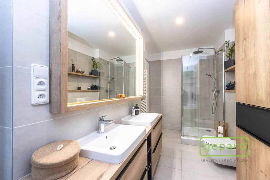 V přízemí je chodba (6,4 m2), prostorný obývací pokoj (26,83 m2) s kuchyní (7,16 m2) a se vstupem na zahradu a zastřešenou terasu. Kuchyně je kompletně vybavená spotřebiči (myčka, horkovzdušná trouba, mikrovlnná trouba, indukční varná deska, digestoř, kombinovaná lednice s mrazákem). Dál je v přízemí samostatné WC (2,16 m2), technická místnost (4,1 m2) s místem pro kotel, pračku a sušičku a úložný prostor pod schody (2,82 m2). V patře jsou 3 ložnice (12,74, 10,24 a 9,35 m2), koupelna s vanou i sprchovým koutem (8,75 m2) a šatna (3,36 m2). V podkroví je možné využít další úložný prostor. Před domem je místo pro parkování 2 automobilů. Dům je nabízen částečně zařízený, zůstává zde kuchyňská linka včetně spotřebičů a nábytek na míru dle dohody. Ve všech oknech jsou hliníkové předokenní rolety, v obytných místnostech a na schodišti je dubová dřevěná podlaha.
