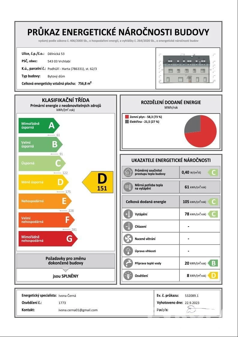 | Ukazatel energetické náročnosti | 151 kWh/m2 za rok |