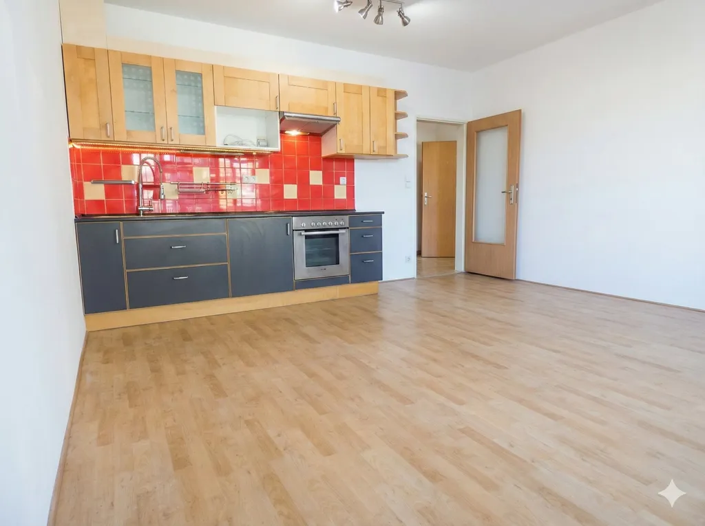 Dominantou bytu je prostorný obývací pokoj s kuchyňským koutem a přímým vstupem na balkon. Kuchyňská linka je vybavena elektrickou varnou deskou, troubou a digestoří s odtahem.