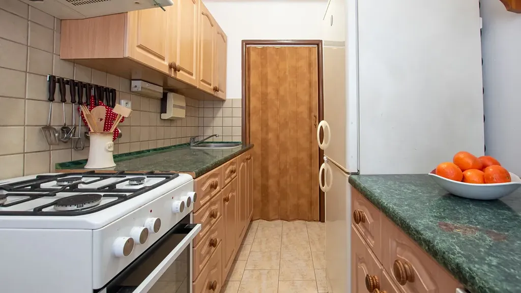 Dispozice bytu je řešena vstupní chodbou, ze které je vstup do koupelny s vanou a samostatného WC, kuchyně se vstupem do dětského pokoje a obývacího pokoje, ze kterého se dostanete do ložnice a na balkón. Máme tu tedy dva neprůchozí pokoje, využité jako ložnice a dětský pokoj. Na chodbě a v kuchyni jsou vestavěné skříně, nabízející dostatek úložného prostoru.