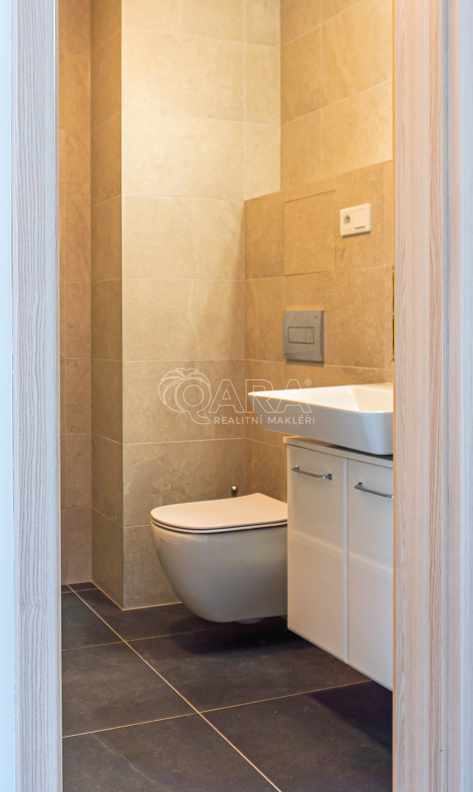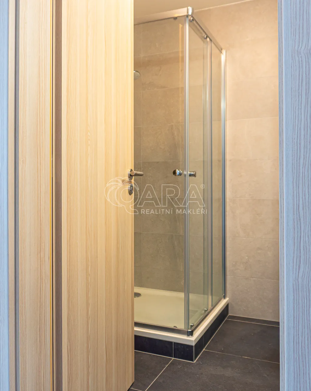 Koupelna se sprchovým koutem je spojená s toaletou a je vybavena pračkou se sušičkou (2 v 1), umyvadlem se skříňkou a zrcadlem.