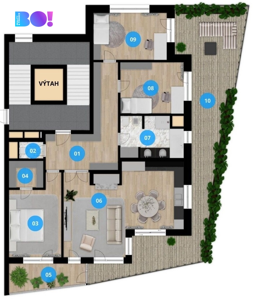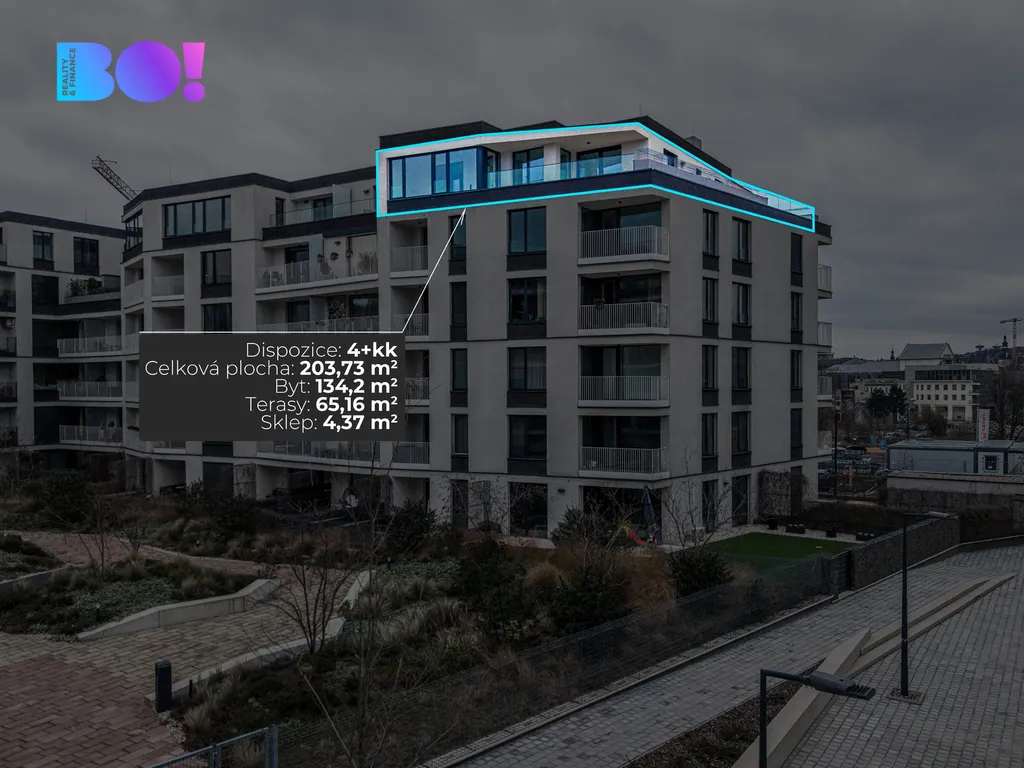 Byt s bazénem 134,2 m² s terasa 65,16 m² a sklepem 4,37 m² je šikovně dispozičně řešen tak, aby nabízel dostatek prostoru pro komfortní bydlení i reprezentativní pracovní zázemí.