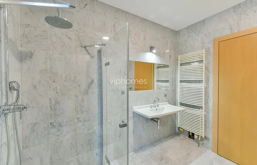 Druhá část bytu je oddělená, nachází se zde koupelna se sprchovým koutem, toaletou a bidetem, šatna. Další místnost lze využít jako pracovnu či pokoj pro hosty a ložnice mají vestavěné skříně.