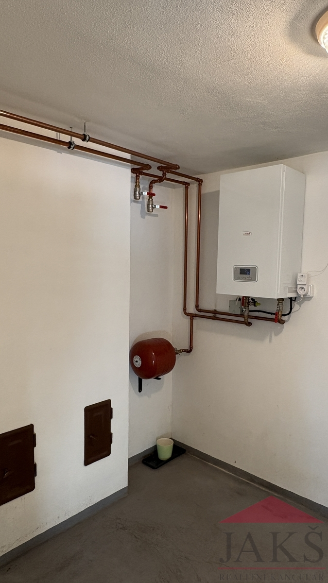 Vytápění: ÚT – elektrokotel s pokojovým termostatem; možnost instalace krbu v obytné části nebo v suterénu automatického kotle na pelety a tím by se dům dostal do „A“ podle navrženého řešení v PENB.