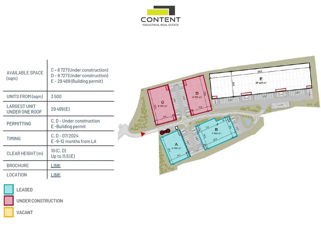 - jednotky od 3494 m² až 29469 m² pod jednou střechou