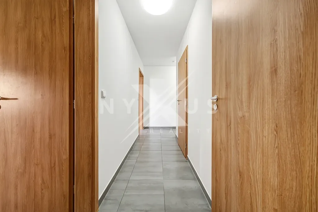 Interiér bytu je řešený předsíní s vestavěnou skříní, obývací částí s plně vybaveným kuchyňským koutem a vstupem na balkon, ložnicí se vstupem na balkon, koupelnou s vanou a místem pro umístění pračky a samostatnou toaletou, prostornou šatnou a menším pokojem. K dispozici garážové stání již v ceně nájemného a sklep.