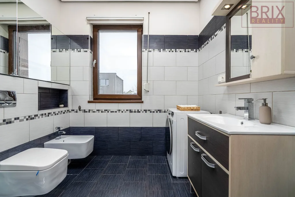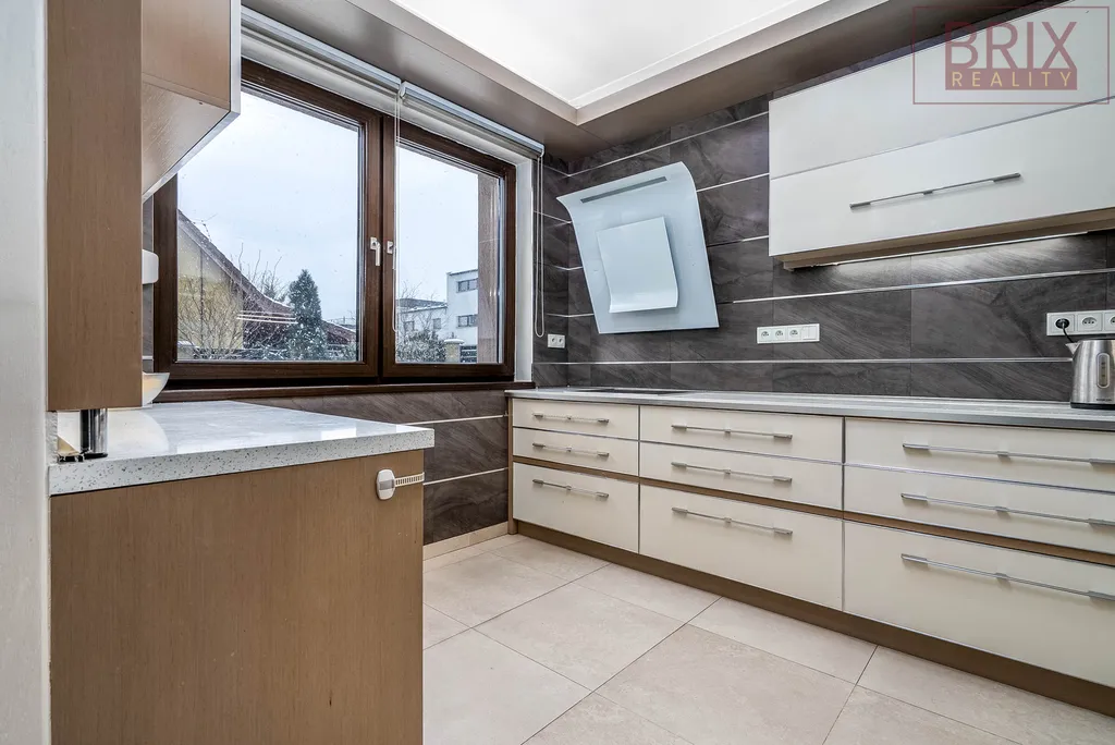 Nabízíme k prodeji krásný a moderní rodinný dům o dispozici 7+kk a celkovou plochou 404 m2. 1. NP 105 m2, 2. NP 99 m2, 1. PP 107 m2. V domě Vás na první pohled zaujme velký obývací pokoj s jídelnou a kuchyňským koutem s krásnými designovými podhledy a stěnou, propracované osvětlení a HS portál, skrz který vstoupíte na zastřešenou a krytou terasu o 19 m2, která Vám rozšíří obývací pokoj a na kterou navazuje druhá terasa o 29 m2. Orientaci mají na jih, takže je můžete využívat větší část roku. Rodinnou atmosféru a pohodu Vám zde navodí zase krbová kamna. Dále zde najdete dva samostatné velké pokoje a velkou koupelnu se sprchovým koutem, dvěma umyvadly a toaletou. Tyto pokoje jdou oddělit posuvnými dveřmi a využívat dům jako dvougenerační. U vstupu je také samostatná toaleta. V patře najdete tři samostatné pokoje, koupelnu a velkou hlavní ložnici s šatnou a vlastní koupelnou. Na koupelnu navazuje vlastní balkon o 3 m2. Dva pokoje jsou zde propojené přes zimní zahradu, na kterou navazuje balkon o 6 m2 s krásným výhledem. V 1. PP Vás jistě zaujme vlastní posilovna, společenská místnost pro Vaše párty, místnost s vířivkou, technická místnost a dva sklady. Prostor u schodiště se nabízí např. na zřízení knihovny. Dům je vytápěný plynovým kondenzačním kotlem pomocí podlahového vytápění. Díky FVE s bateriemi ušetříte za elektřinu a můžete si ze sluníčka také nabít auto. Zahradu si jistě zamilujete díky krásnému trávníku a okrasným stromkům a keřům. Je zde také automatická závlaha. V samostatné garáži o 19 m2 zaparkujete až 3 auta. Jedno uvnitř a až dvě pod přístřeškem o 17 m2. Nenechte si utéct tuto skvělou nabídku a přijďte se podívat na prohlídku.