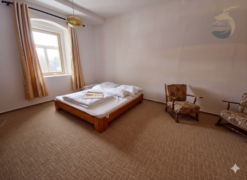 V patře jsou dva pokoje tvořené vždy dvěma vzájemně propojenými místnostmi a dále jeden centrální prostorný pokoj s balkonem a výhledem do okolní krajiny. Součástí patra je také druhá koupelna, která byla realizována v roce 2025, včetně instalace podlahového vytápění. Dispozičně patro nabízí celkem pět místností.
