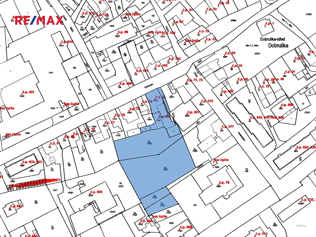 Prodej mimořádného souboru nemovitostí na výborném, lukrativním místě Dobrušky, hned u levého okraje od centrálního náměstí F.L. Věka. Nemovitost vhodná pro více rodin nebo spolupracující firmy. Předmětem prodeje je pozemek parc. č. 114/1 (394 m2) jehož součástí je prvorepubliková, stylová, vícepodlažní vila č.p. 73 s impozantním vnitřním schodištěm a terasou do vlastního dvora, sousední pozemek 114/2 (508 m2), včetně rodinného domu č.p. 799, dvou garáží a s terasou do vlastněné zeleně (zahrad). Domy jsou velmi prostorné. V každém domě jsou velké půdní prostory. Součástí areálu je velký dvůr, který se nachází mezi oběma domy. Vjezd do areálu je z ulice Opočenská vedle pošty, vlastní uličkou (parc. č. 113), - 100 m2). K nemovitostem dále patří 4 propojené a nezastavěné zahrady o celkové výměře 4.854 m2 ( p. č. 112/2 - 1499 m2, 112/1- 2668 m2, 112/4 - 328 m2, 111/3 - 359 m2), umístěné až k objektu kina.
