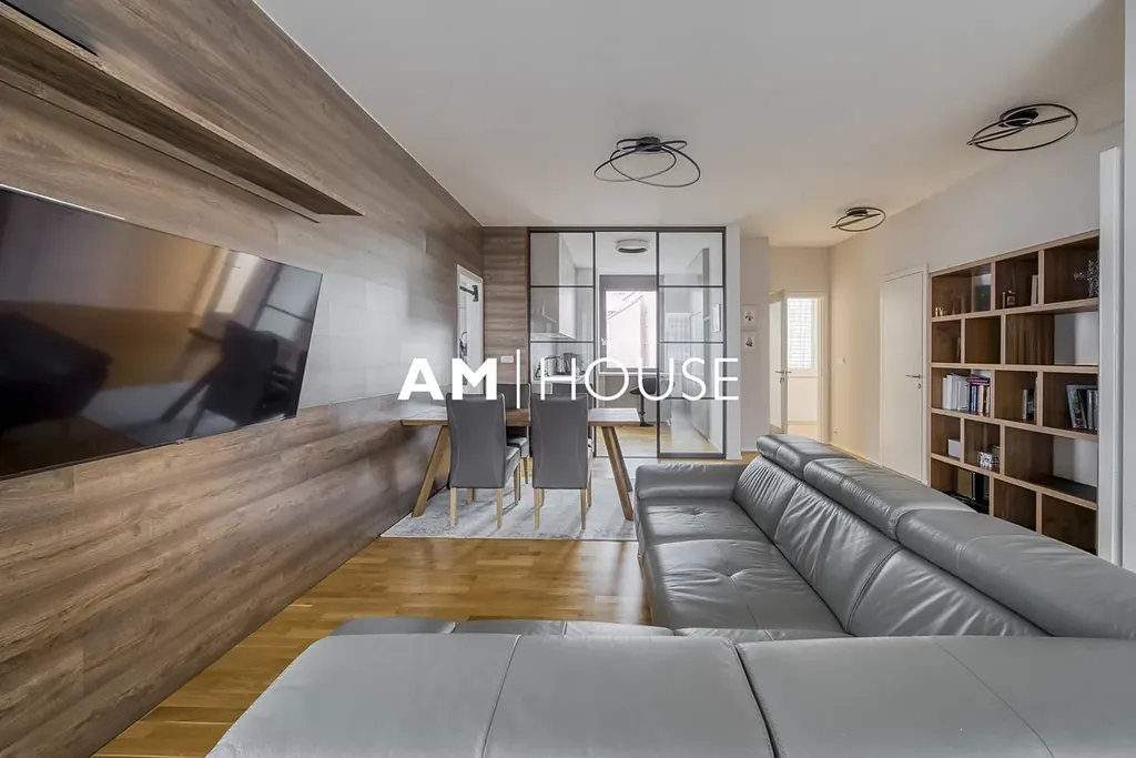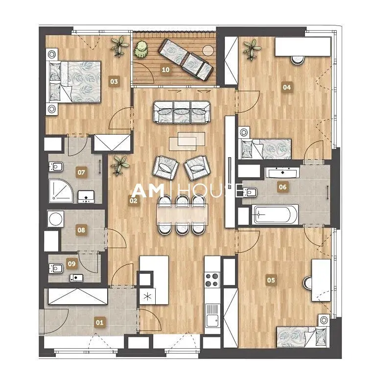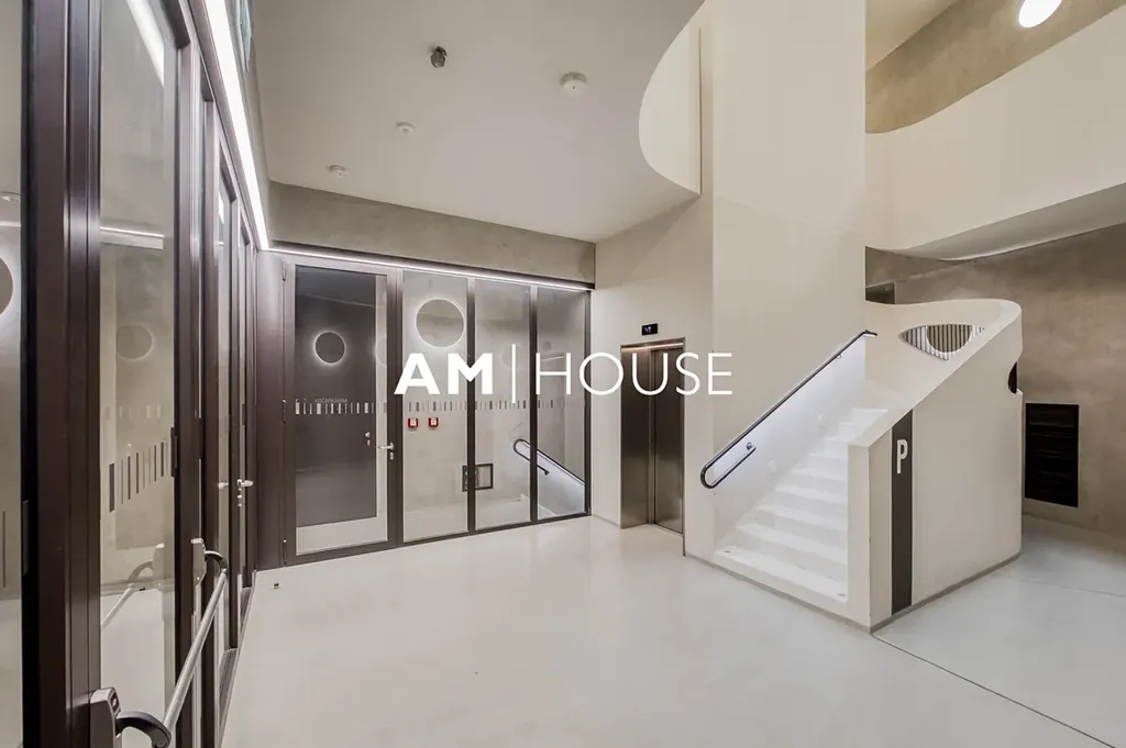 Centrum obývací části představuje velký pokoj s kuchyňským koutem odděleným skleněnou zdi s posuvnými dveří. Jedna ložnice ma koupelnu se sprchovým koutem, umyvadlem a WC, dva další pokoje jsou spojené koupelnou s vanou. V být je další samotné WC a technická místnost/prádelna.