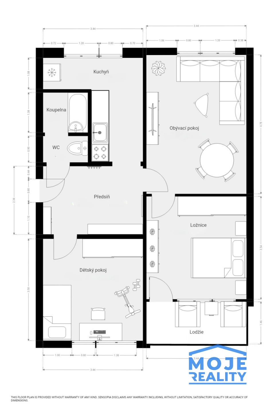 Dispozice bytu je velmi praktická. Po vstupu se nachází prostorná předsíň, ze které je přístup do koupelny s toaletou. Z chodby je dále vstup do samostatného pokoje, vhodného jako dětský pokoj či pracovna, a také do kuchyně a obývacího pokoje. Z obývacího pokoje se vstupuje do dalšího pokoje, ideálního jako ložnice, s přímým vstupem na prostornou lodžii.