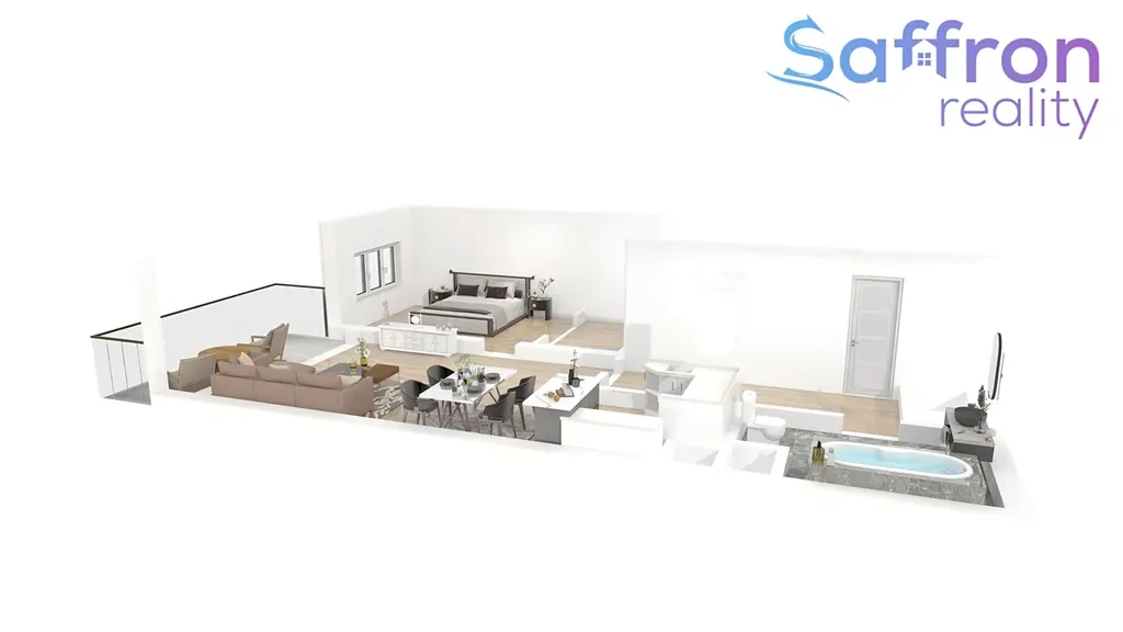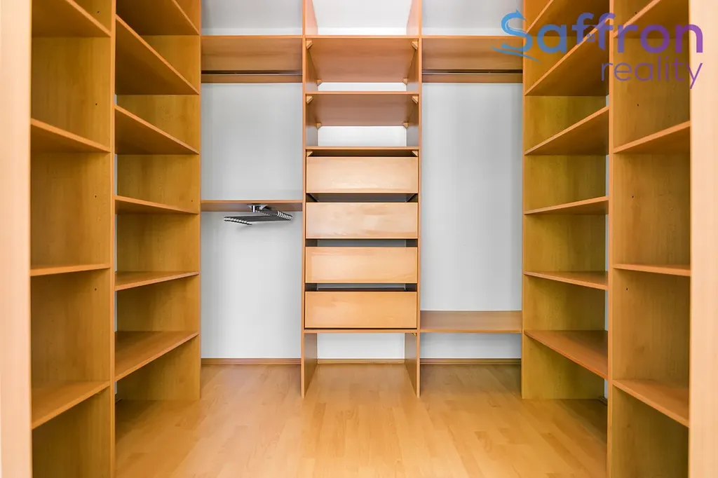 Obývací část plynule navazuje na kuchyň s barovým pultem, která je plně vybavena spotřebiči – k dispozici je lednice s mrazákem, myčka, sklokeramická varná deska, trouba, digestoř i mikrovlnná trouba. Vstupní chodba nabízí vestavěné skříně na míru, koupelna je řešena s vanou, toaletou a pračkou.
