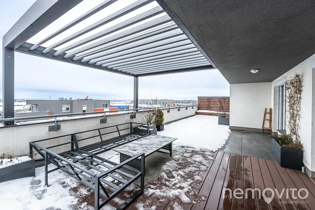 - terasa o velikosti 55 m² s pergolou s elektricky ovládanými lamelami a komfortní venkovní sedací soupravou