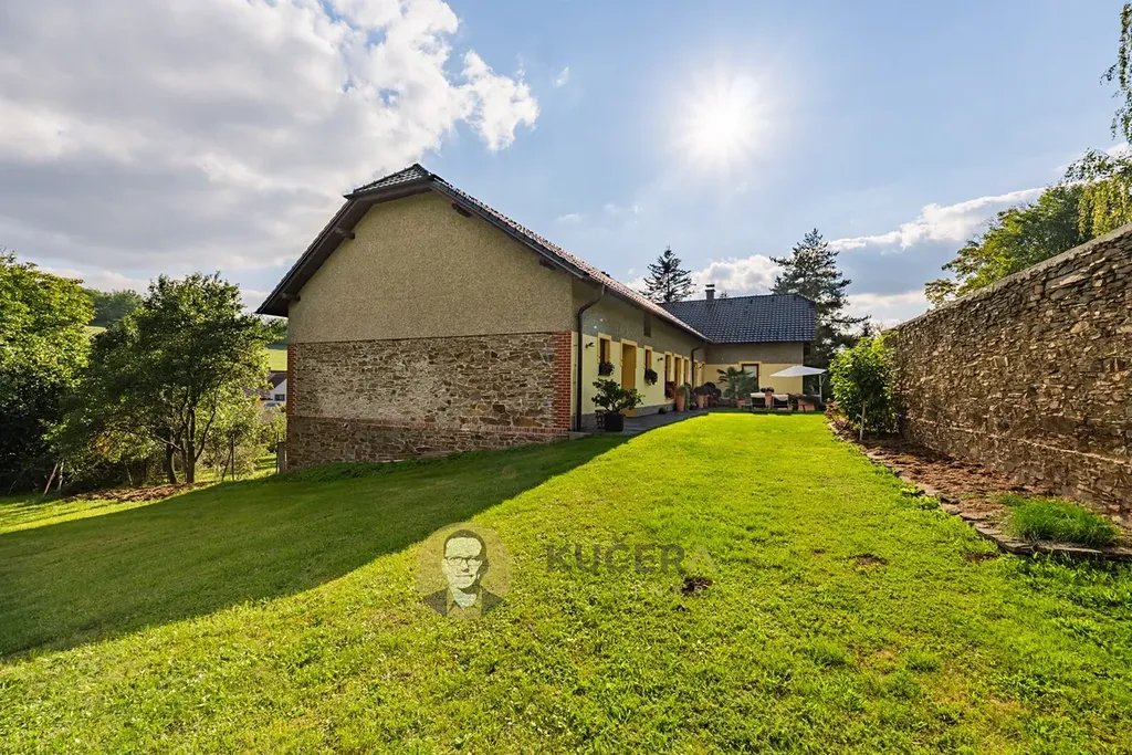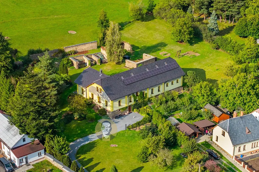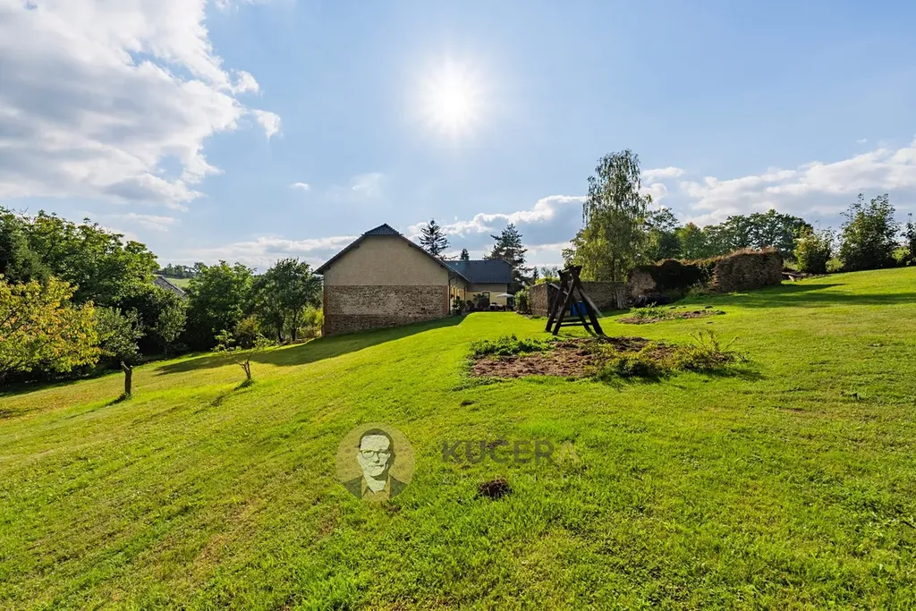 Ve vzrostlé zahradě o rozloze 7 360 m² stojí prostorný rodinný dům ve tvaru písmene L, který prošel kompletní rekonstrukcí. Součástí této nabídky jsou také pozemky o rozloze 144 925 m², které lze využit pro rekreaci, chov zvířat, vlastní les nebo čistě jako investici.
