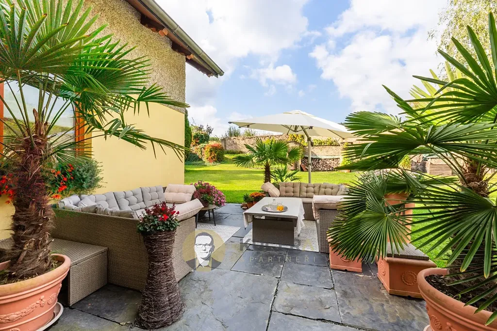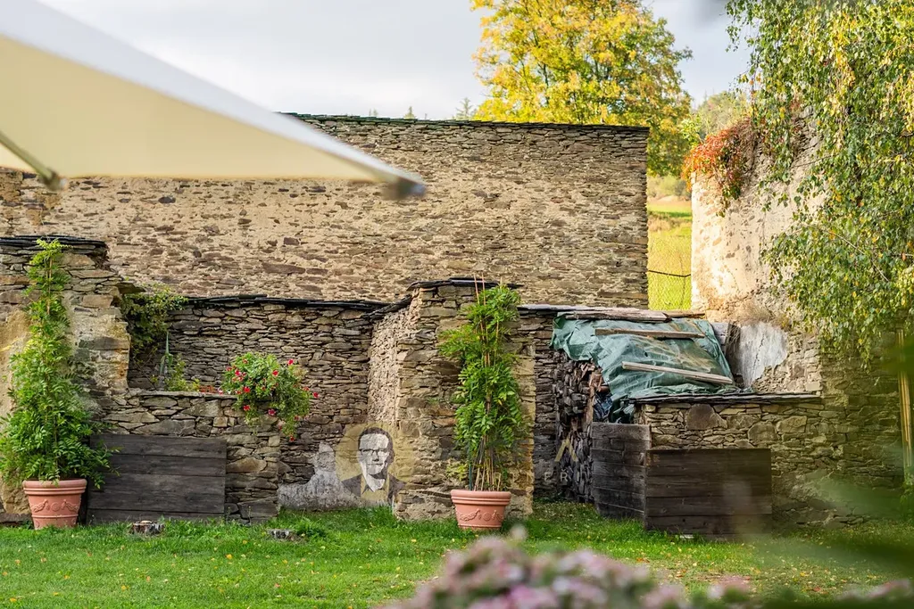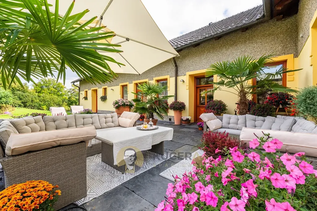 Atmosféru celého místa dotváří kamenné zdi původních stodol, které byly citlivě začleněny do zahrady a vytvářejí jedinečný rámec připomínající malebnou toskánskou scenérii. K domu přímo navazuje terasa z přírodní břidlice o ploše 40 m², ideální pro letní posezení nebo rodinné oslavy.