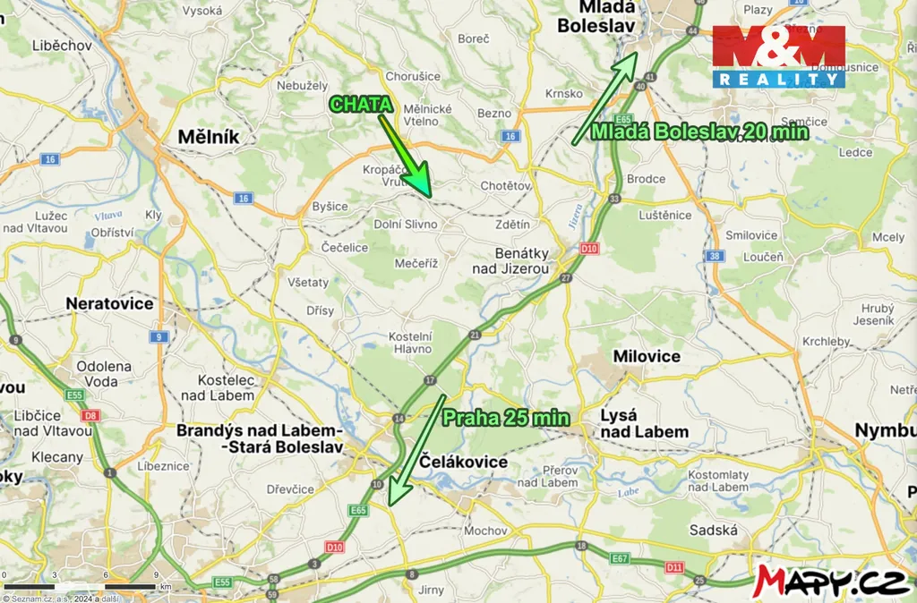 Dojezdová vzdálenost do Prahy 25 min a do Mladé Boleslavi 20 min. Pohodlné spojení vlakem.
