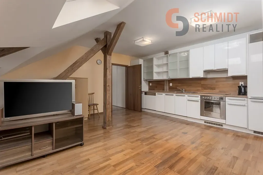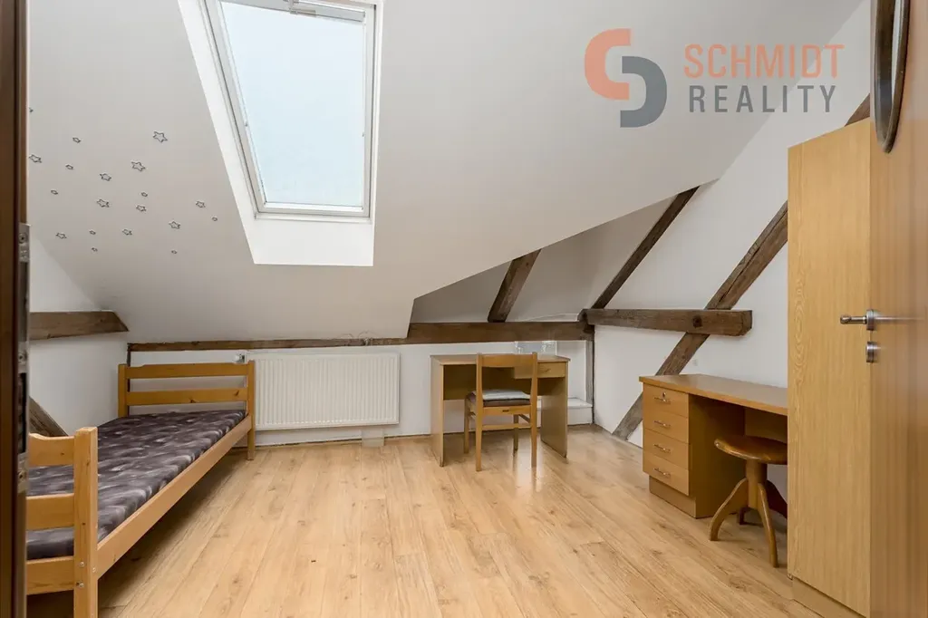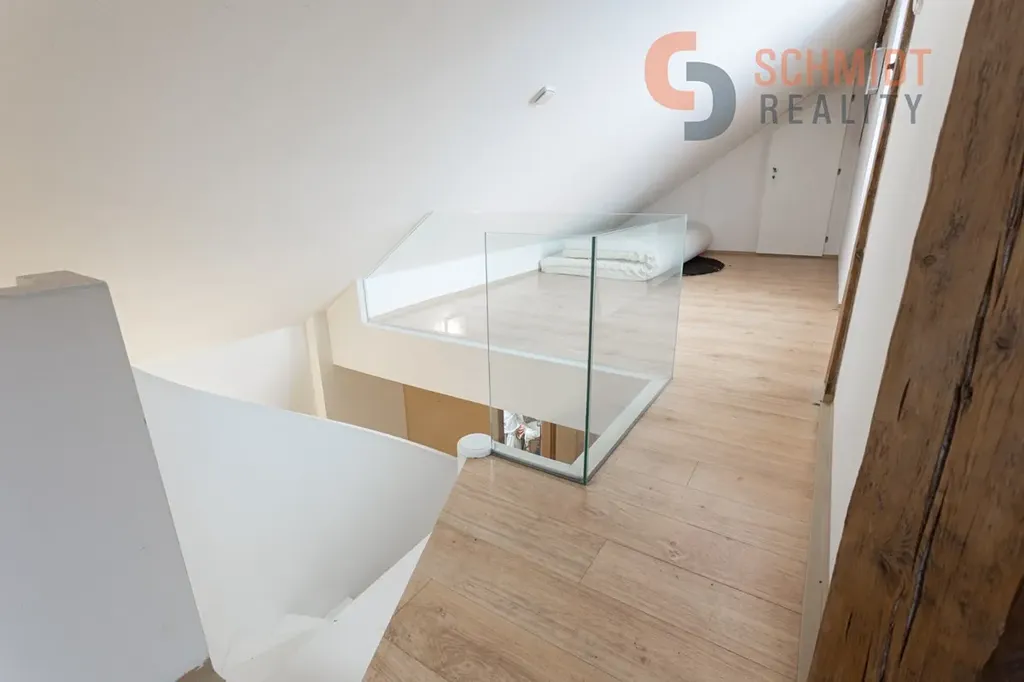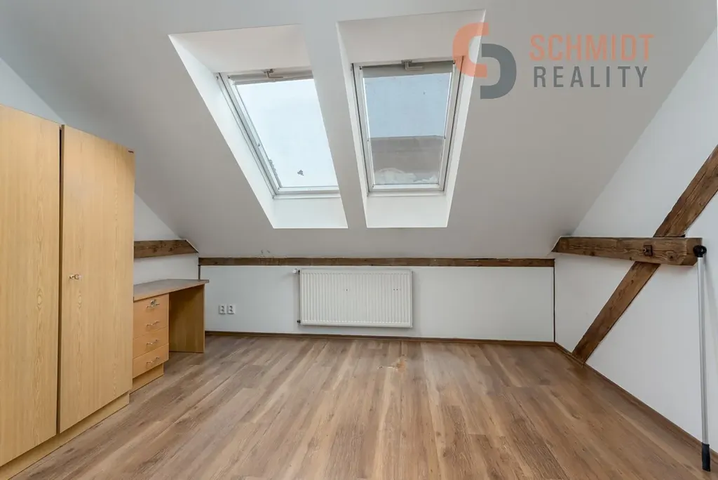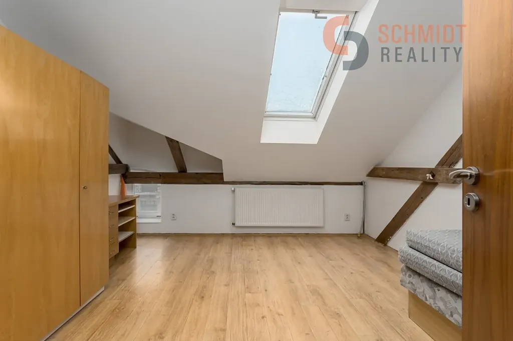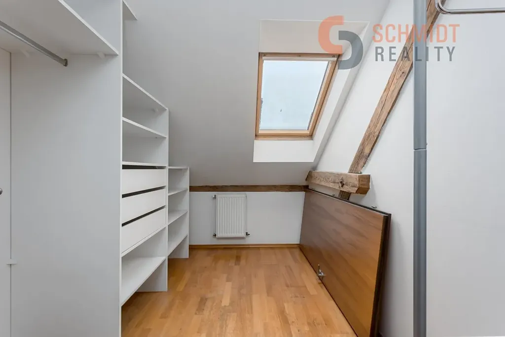 Dominantou bytu jsou schody vedoucí do podkrovní části, která je v současnosti využívána jako skladovací prostor. Tento prostor však nabízí velký potenciál k dalšímu rozšíření obytné plochy – po citlivé úpravě a ve spolupráci se šikovným architektem zde může vzniknout atraktivní nová část bytu (např. ateliér, ložnice či pracovna).
