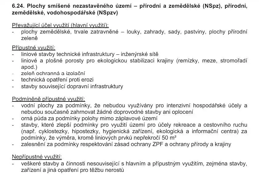 Parcela je v územním plánu vedena jako „Plochy smíšené nezastavěného území“, kde je dle územního plánu možné využití na zahradu, pastvinu, sady a louky. Je tedy vhodné na zahradu i pro milovníky koní nebo drobné chovatele na pastvinu. Díky odlehlému místu je zde naprostý klid.