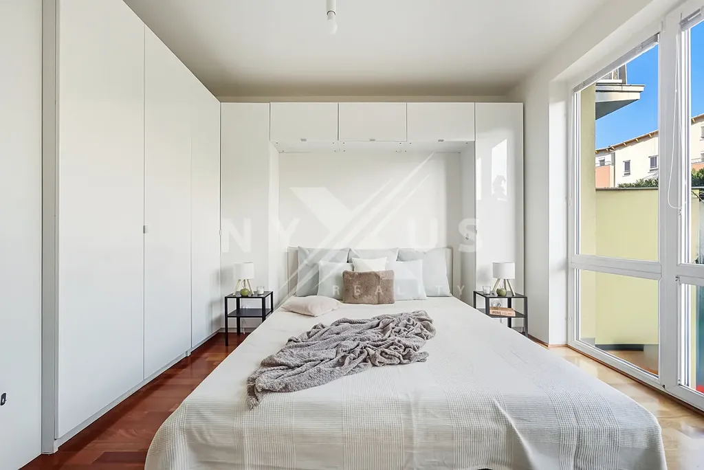 Dominantou bytu je velkorysý obývací pokoj s kuchyňským koutem o rozloze 36,1 m², vybavený francouzskými okny orientovanými na západ, díky nimž je interiér po celý den krásně prosvětlený a plynule propojený s terasou.