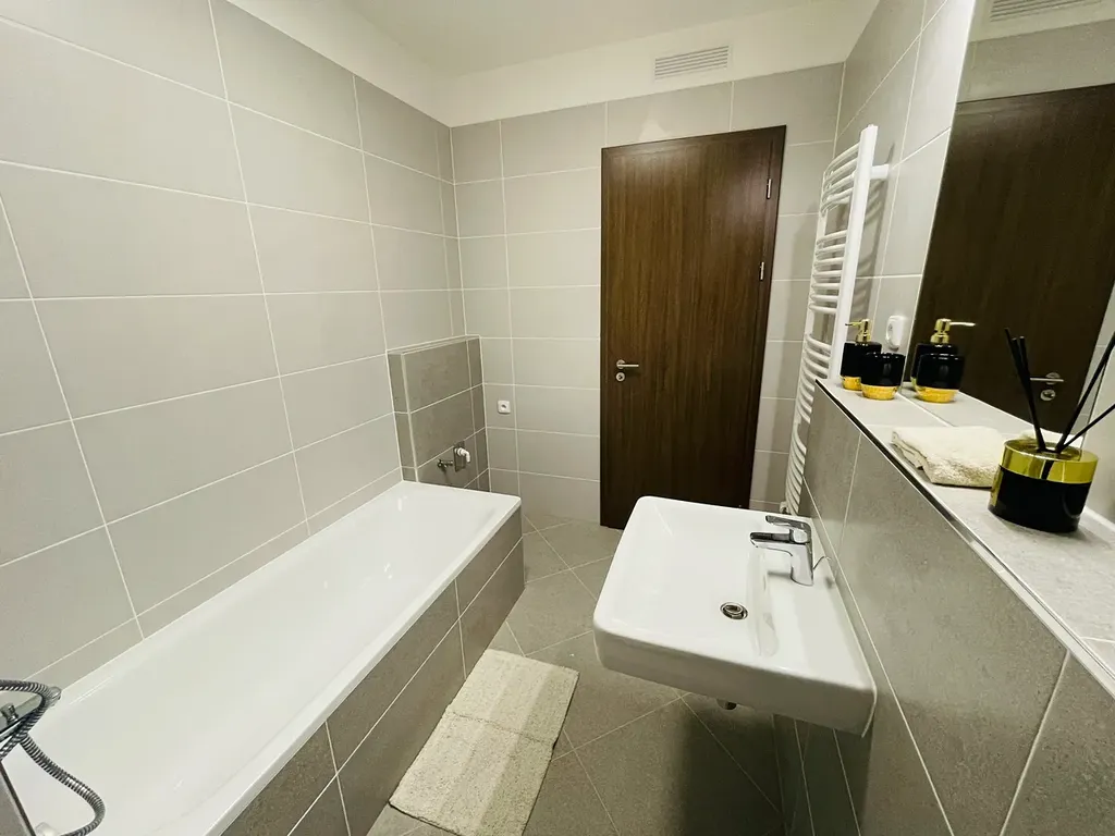 V koupelně vana se zástěnou, topný žebřík a závěsné WC, dále interiérové dveře, plastová okna, plovoucí podlaha a dlažba, protipožární vchodové dveře.