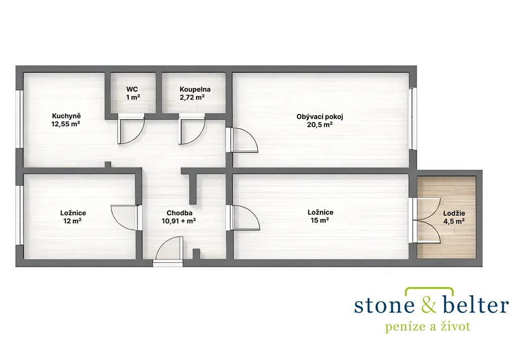 - orientace: obývací pokoj a pokoj s lodžií na jihovýchod, druhá ložnice na severozápad