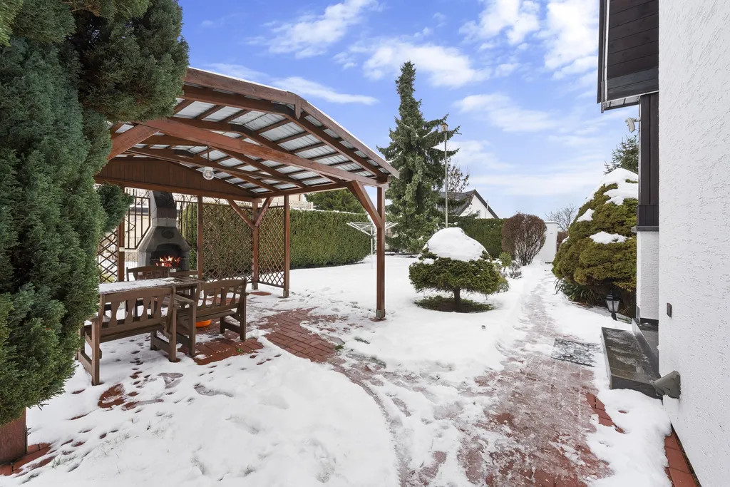 Na pozemku se nachází pergola pro letní posezení a také dostatek místa pro parkování dalších vozidel, což výrazně zvyšuje komfort každodenního užívání.