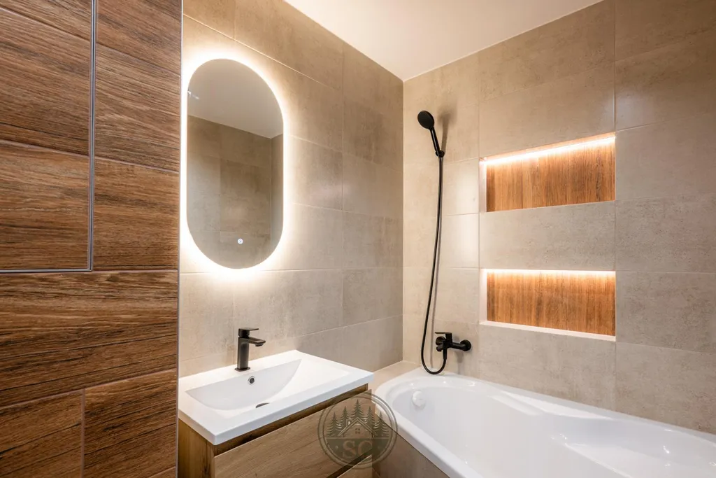 Koupelna je řešena s důrazem na detail a atmosféru. Nad vanou jsou vytvořeny dvě designové niky s integrovaným osvětlením. Zrcadlo nabízí tři režimy osvětlení (teplé, neutrální a studené světlo), celý prostor doplňují bodová svítidla. Samozřejmostí je závěsné WC a bidetová sprška.