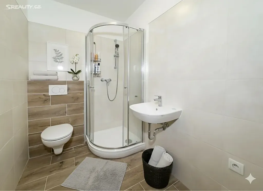 Vytápění i ohřev teplé vody jsou zajištěny centrálním plynovým kotlem. Koupelna je vybavena sprchovým koutem, umyvadlem, závěsným WC, elektrickým topným žebříkem a ventilátorem. Součástí je také příprava pro připojení pračky. Energetická náročnost budovy odpovídá třídě D.